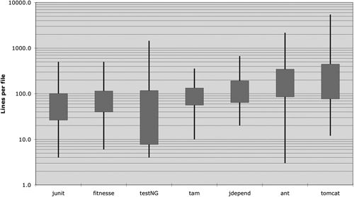 Seven different projects are depicted. Junit, FitNesse, testNG, Time and Money, JDepend, Ant, and Tomcat. The lines through the boxes show the minimum and maximum file lengths in each project. The box shows approximately one-third (one standard deviation1) of the files. The middle of the box is the mean. So the average file size in the FitNesse project is about 65 lines, and about one-third of the files are between 40 and 100+ lines. The largest file in FitNesse is about 400 lines and the smallest is 6 lines. Note that this is a log scale, so the small difference in vertical position implies a very large difference in absolute size.